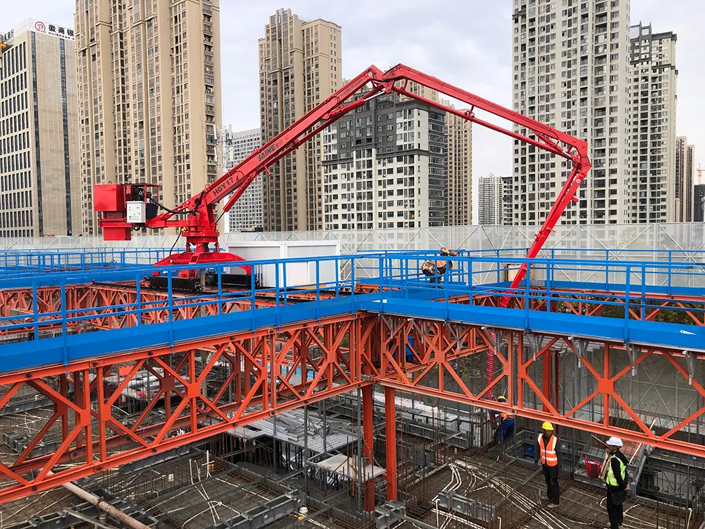 下掛式造樓機(jī)專用混凝土布料機(jī)固定并懸掛在平臺(tái)貝雷架的下方,負(fù)責(zé)平臺(tái)下方樓板等結(jié)構(gòu)的混凝土澆筑。下掛式布料機(jī)采用三節(jié)臂全回轉(zhuǎn)設(shè)計(jì),保證布料機(jī)能夠繞開貝雷架下方空間內(nèi)的支撐立柱、掛桿掛件、部分鋼構(gòu)件等干涉部件,最大范圍的覆蓋澆筑整個(gè)施工作業(yè)面。下掛式布料機(jī)還具有以下特點(diǎn):
