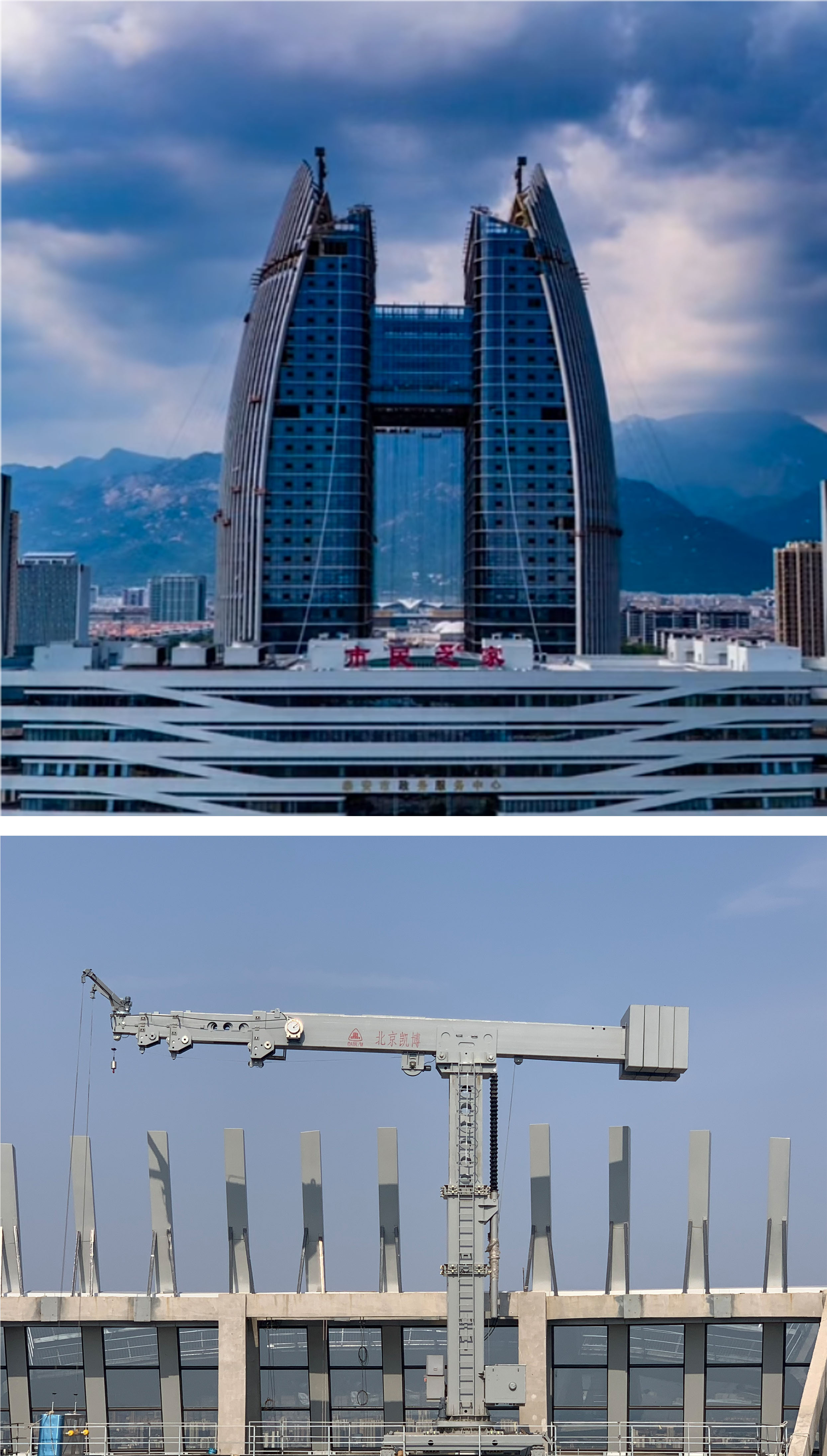 ??分立于泰安金融商務(wù)中心東塔、西塔頂端的2臺(tái)大型擦窗機(jī)設(shè)備?