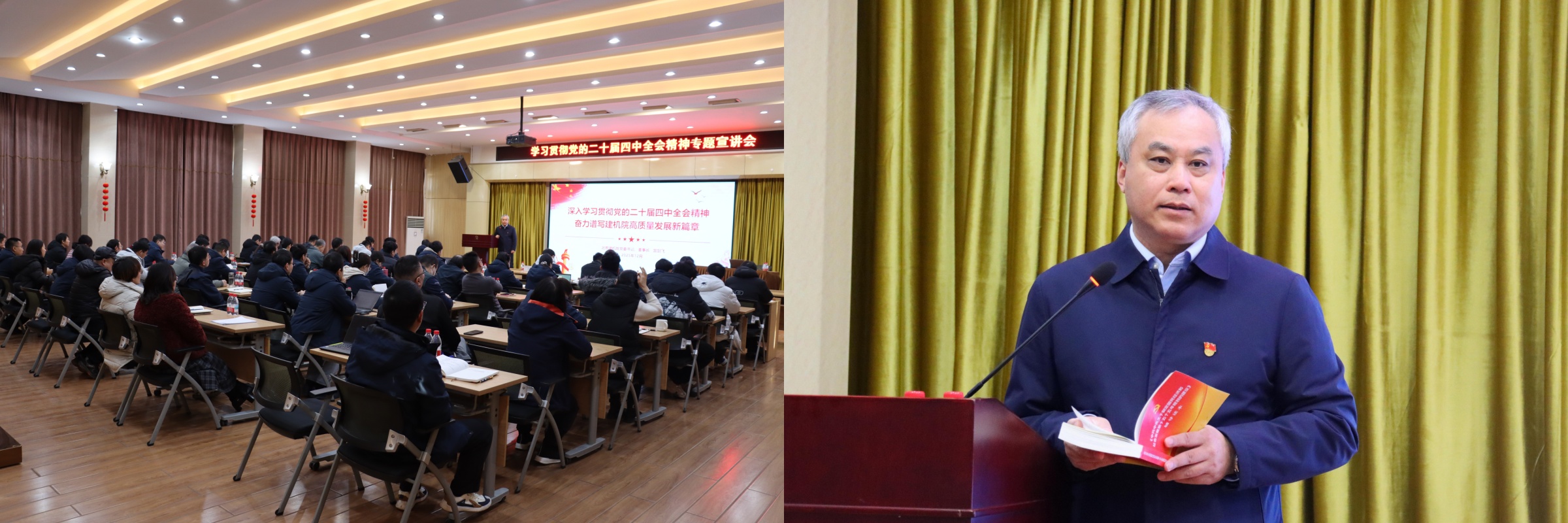 為深入學習貫徹黨的二十屆四中全會精神,12月30日上午,北京建機院舉辦學習貫徹黨的二十屆四中全會精神專題宣講會,北京建機院黨委書記、董事長宮劍飛作專題宣講。北京建機院黨委委員、紀委委員,職能部門、科技創(chuàng)新研究院及子公司正副職負責人,所屬黨支部書記及支部委員,建研檢測黨支部全體黨員,專兼職黨務工作人員,黨外人士,派遣制黨員,35歲以下團員青年等160余人參加會議。